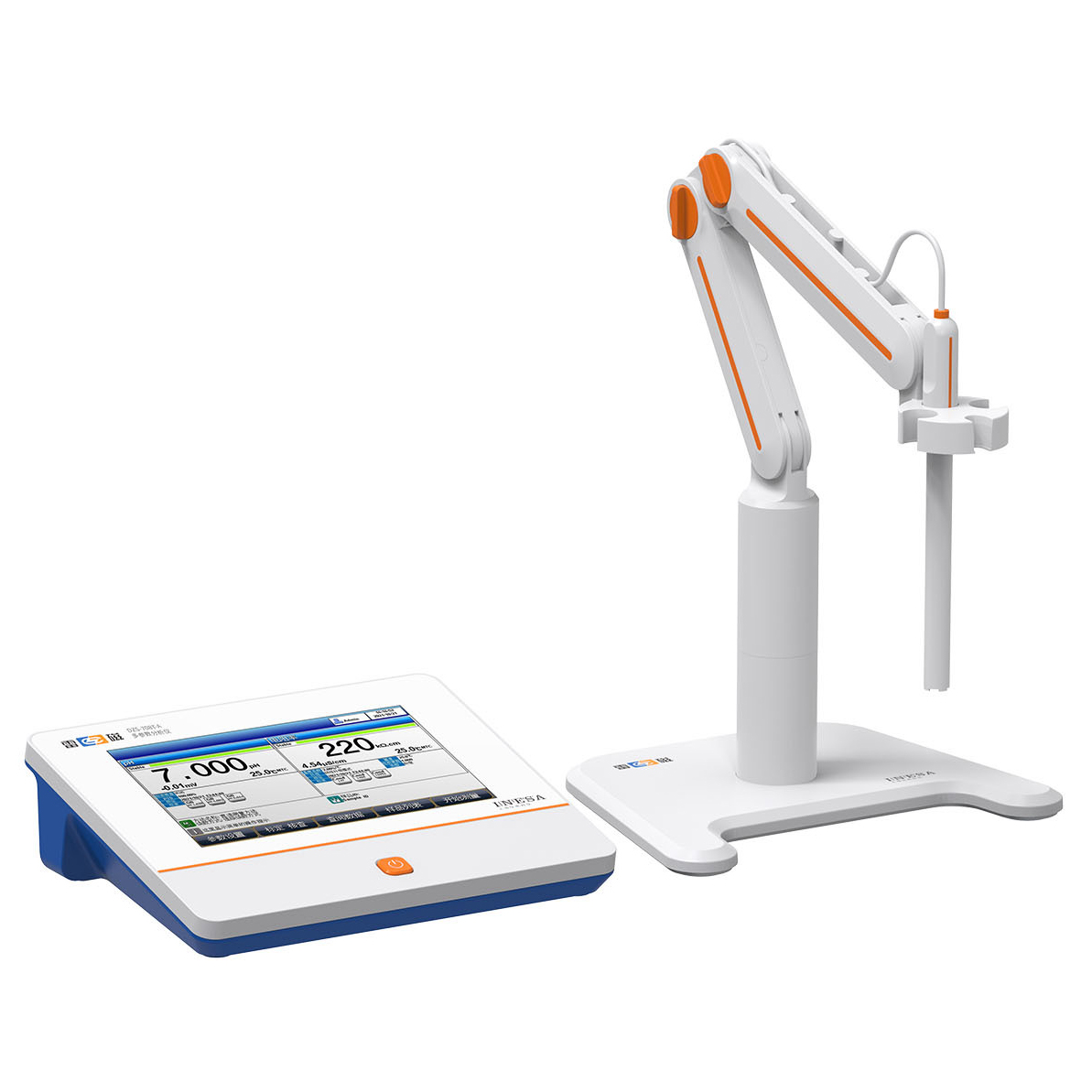 標配三復合pH電極、復合電導電極、獨立電極支架、防塵罩和袋裝校準溶液